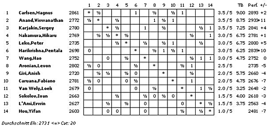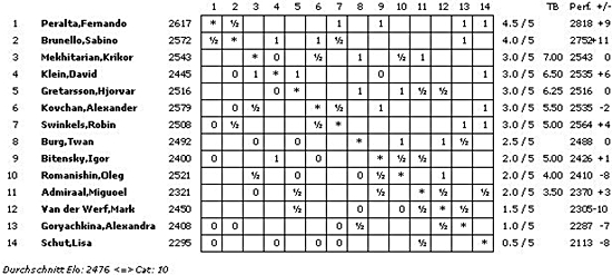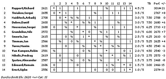 Die A-Gruppe erreicht mit einem ELO-Schnitt von 2732 die Kategorie 20 (2012: 2754/21; 2011: 2739/20), die B-Gruppe 2620 und Kategorie 15 (2012: 2602/15; 2011: 2658/17) und die C-Gruppe 2476 und Kategorie 10 (2012: 2454/9; 2011: 2507/11).