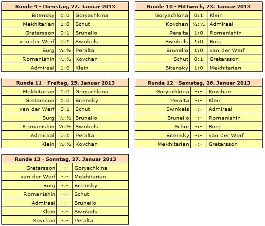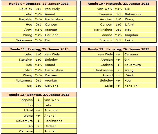 Rundenstart ist jeweils um 13:30 Uhr, lediglich die letzte Runde am 27. Januar beginnt bereits um 12:00 Uhr. Ruhetage werden am 16., 21. und 24. Januar eingelegt.