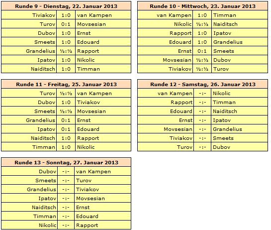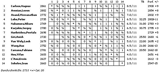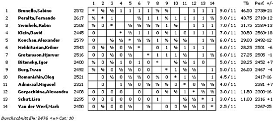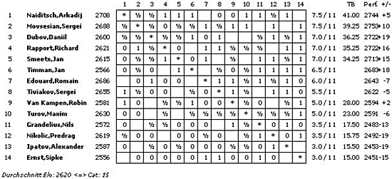 Die A-Gruppe erreicht mit einem ELO-Schnitt von 2732 die Kategorie 20 (2012: 2754/21; 2011: 2739/20), die B-Gruppe 2620 und Kategorie 15 (2012: 2602/15; 2011: 2658/17) und die C-Gruppe 2476 und Kategorie 10 (2012: 2454/9; 2011: 2507/11).