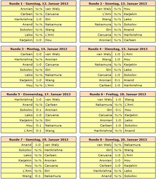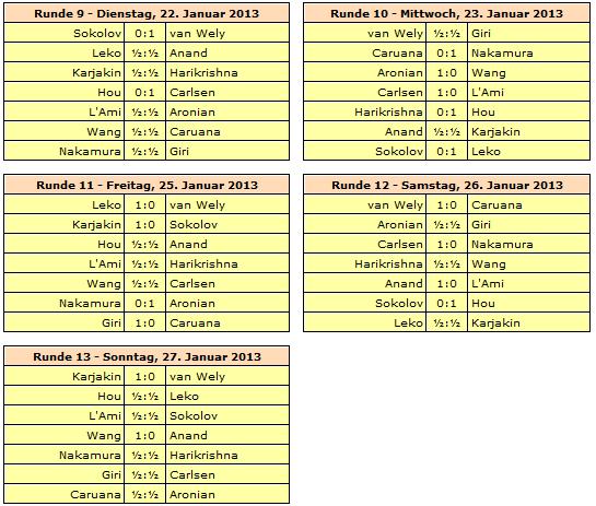Der Weltmeister darf reinen Gewissens eine positive Bilanz ziehen. Was 2012 einfach nicht klappen wollte, gelang dem Inder zum Auftakt 2013 gleich vier Mal - er gewann endlich wieder Partien in einem klassischen Turnier. Bekannt selbstkritisch wird Anand mit sich klären, wie das unnötige Remis gegen Hou Yifan und die Niederlage in der Schlussrunde gegen Wang Hao passieren konnten. Dass er nach wie vor in der Lage ist, furiose Angriffspartien zu spielen, bewies er in der vierten Runde. Levon Aronian geriet in eine für Boris Gelfand vorbereitete Variante Anands und musste die Rolle des tragischen Helds in der mit Abstand schönsten Partie des Tata Steel 2013 einnehmen. Nein, keine Sorge, die "Perle von Wijk" gebührt weiterhin Garry Kasparov für seinen Sieg 1999 gegen Veselin Topalov, aber Anands Klassiker wird ebenfalls in die 75-jährige Schachgeschichte der niederländischen Ortschaft an der Nordseeküste eingehen. Auf Carlsens Siege angesprochen, lobte Anand besonders dessen Chancenverwertung. Alle wünschen sich ein WM-Match gegen den Weltranglistenersten, garantiert auch Anand selbst! Genug geredet und geschrieben, es wird endlich Zeit, dass DAS Schach-Duell des 21. Jahrhunderts stattfindet! Wenn da nicht vorher dieses bereits erwähnte Turnierchen in London wäre... Man stelle sich mal vor, was los wäre, wenn Boris Gelfand dort gewönne. Verrückte Idee, ich weiß! ;-)