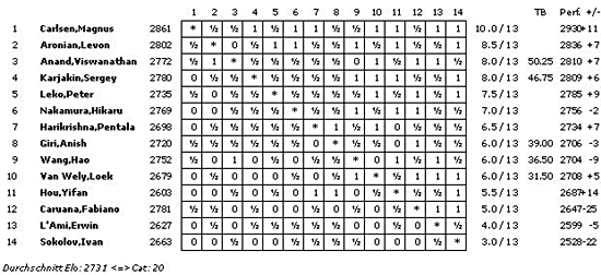 "Wenn ich mich heute Nacht nicht umbringe, lebe ich noch 1000 Jahre!", lautete Ivan Sokolovs Reaktion, nachdem er in der zweiten Runde eine klar gewonnene Stellung gegen Nakamura noch zum Remis verdorben hatte. Nun, bildlich hat sich Ivan der Schreckliche glücklicherweise nicht selbst gerichtet, aber sprichwörtlich durchaus. Von dem Schock erholte sich Sokolov nicht mehr und wurde von der Konkurrenz fortan als Sandsack missbraucht. -7 im Vergleich zu den +7 von Carlsen sprechen eine deutliche Sprache und werden den wahren Fähigkeiten des Ivan Sokolov in keiner Weise gerecht. Die 2700 ist für den 44-Jährigen jetzt erstmal in Weite Ferne gerückt.