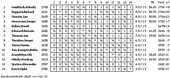 Aber der stets freundliche Mov ließ im weiteren Verlauf die Zügel etwas schleifen, während Rapport und Naiditsch unverdrossen auf das große Ziel hin spielten. In der elften Runde dann folgte das entscheidende Duell zwischen Naiditsch und Rapport, welches ersterer für sich entschied. Zwei Runden vor dem Ende sah es so aus, als wäre für Rapport das Rennen verloren. Aber mit zwei Siegen zum Abschluss übertrumpfte er Naiditschs 1,5 und Movsesians 1,0.