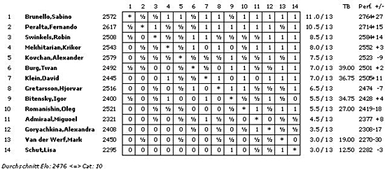 entwickelte sich vom Start weg ein wortwörtliches Wettrennen zwischen Fernando Peralta und Sabino Brunello. Im direkten Duell in Runde 3 war man sich einig, sich nicht gegenseitig weh zu tun, aber in allen anderen Partien kämpften der Argentinier und der Italiener verbissen und extrem erfolgreich um den Gruppensieg. Mal hatte Peralta die Nase vorn, dann Brunello, dann beide zusammen, und dem Rest des Feldes fiel nur die Statistenrolle zu. Ein gutes Turnier spielten eigentlich nur Robin Swinkels auf Rang 3 und IM David Klein, welcher vermutlich knapp eine GM-Norm verpasste.