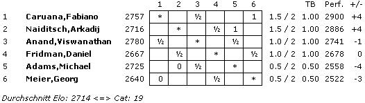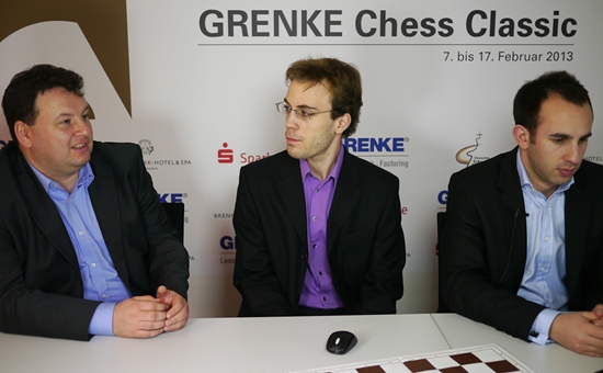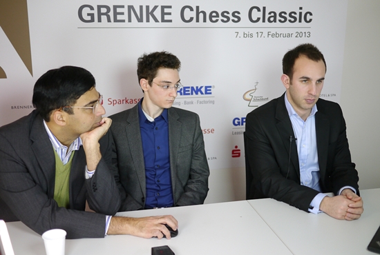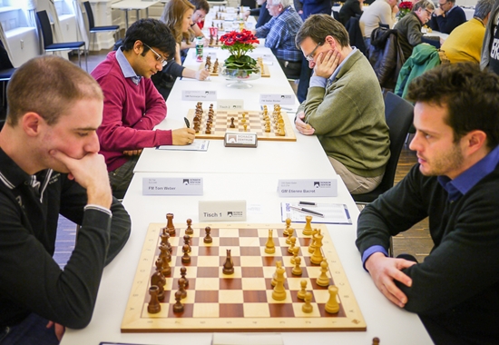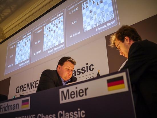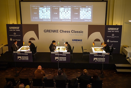 08.02.2013 - "Keine Sieger in der zweiten Runde der GRENKE Chess Classic (GCC) in Baden-Baden", so hätte beinahe das Fazit des Tages gelautet. Lange Zeit sah es nach drei Unentschieden aus, doch der Reihe nach: Den Anfang machten Viswanathan Anand und Fabiano Caruana. Der Italiener hatte im Spanier als Schwarzer mit 23...d5! eine Beinahe-Neuerung in petto, welche der Weltmeister erst zu spät erkannte. "Beinahe-Neuerung" deshalb, denn der gleiche Zug wurde bereits in einer Fernschachpartie gespielt, welche Caruana mit Sicherheit kannte. Das nächste Remis wurde nach nur 26 Zügen und dreimaliger Stellungswiederholung zwischen Daniel Fridman und Georg Meier vereinbart. Wirklich packend war dieses Duell wahrlich nicht, was wohl daran liegt, dass Fridman bei diesem Turnier jederzeit zehn Remisen unterschreiben würde. Was seine beiden Landsleute an Kampfgeist vermissen ließen, versuchte Arkadij Naiditsch als Weißer gegen Michael Adams auszubügeln, und es gelang ihm mit Bravour. Mehrfach konnte die deutsche Nummer 1 das Remis sichern, aber Naiditsch spielte unverdrossen in nahezu ausgeglichener Lage auf Sieg und wurde nach fast sieben Stunden Spielzeit und 79 Zügen mit dem vollen Punkt belohnt. Damit zog er zu Caruana gleich an die Spitze der Tabelle. Im parallel ausgetragenen ELO-Open musste Favorit Etienne Bacrot übrigens erste Federn lassen und liegt mit 1,5/2 auf Rang 5. Es führen vier Hundertprozentler (Parimarjan Negi, Viorel Iordachescu, Ruben Felgaer & Boris Chatalbashev). Auch heute erfreut uns unser Chess Tiger on Tour Eric van Reem mit exklusiven Bildern aus Baden-Baden und hat zugleich in seinem Blog einen neuen Beitrag mit dem Titel "Supertournaments" veröffentlicht. Hauptthema ist der Vergleich zwischen Baden-Baden 2013 und 1870.