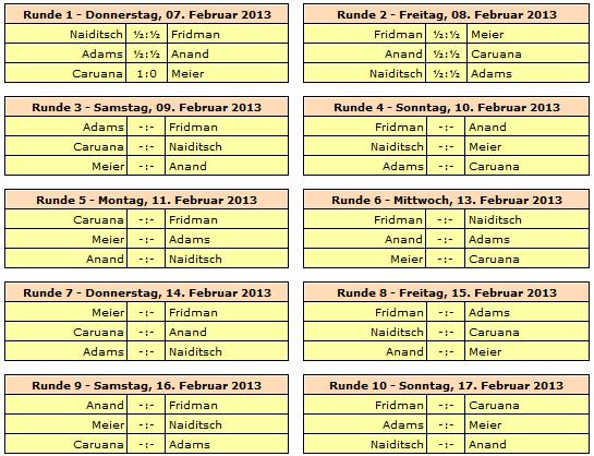 Rundenstart ist jeweils um 15:00 Uhr, lediglich die letzte Runde am 17. Februar beginnt bereits um 13:00 Uhr. Der einzige Ruhetag wird am 12. Februar eingelegt.