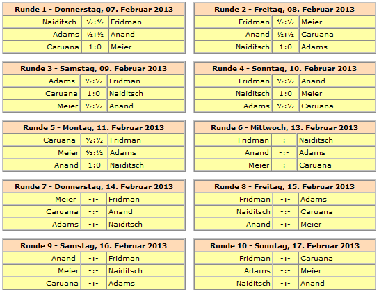 Rundenstart ist jeweils um 15:00 Uhr, lediglich die letzte Runde am 17. Februar beginnt bereits um 13:00 Uhr. Der einzige Ruhetag wird am 12. Februar eingelegt.