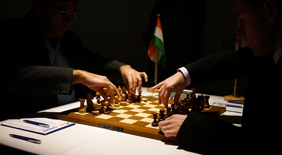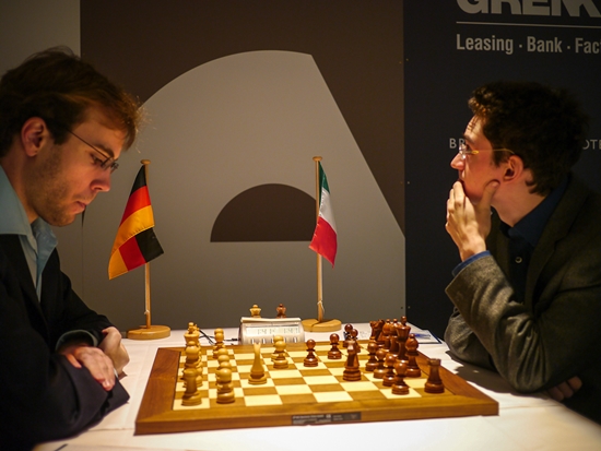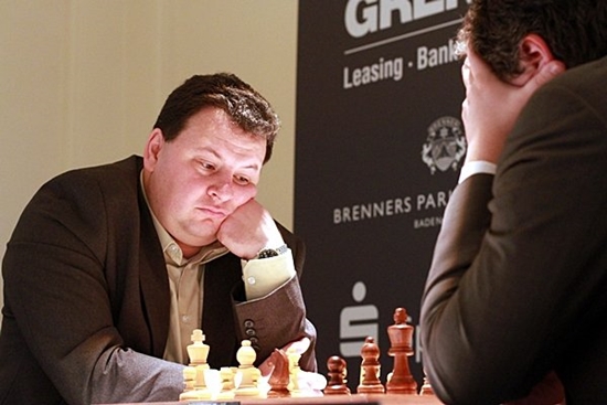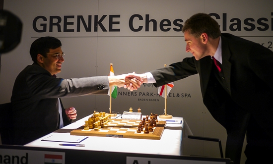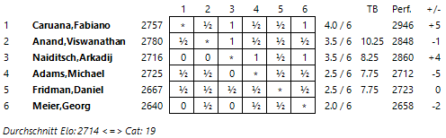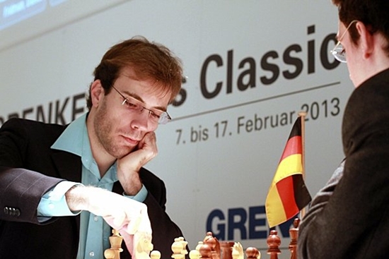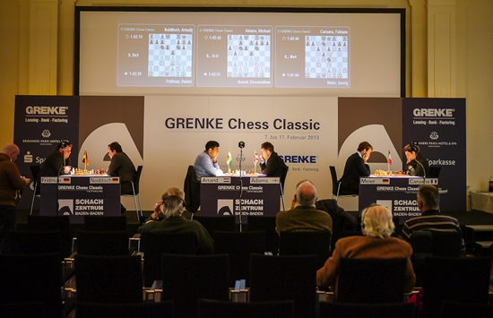 13.02.2013 - "This guy is on fire!", lautete das Lob von Weltmeister Viswanathan Anand Richtung Arkadj Naiditsch beim heutigen Pressetermin nach der eigenen Partie gegen Michael Adams. Auch nach sechs Runden GRENKE Chess Classic hat die deutsche Nummer 1 nur ein Remis auf dem Konto, welches aus der ersten Runde gegen Daniel Fridman stammt. Selbiger kam heute allerdings nicht nochmals so glimpflich davon, Der Deutsche Meister wurde von einem bis in die Haarspitzen auf Randale eingestellten Naiditsch von Beginn an hart rangenommen. Gut möglich, dass Fridman sogar mal besser stand, aber im Naiditschen Königsangriff brach er dann doch zusammen und konnte trotz beharrlicher Gegenwehr seine erste Niederlage nicht abwenden, was nicht zuletzt an 37...d5!! lag. Dagegen verblassten die beiden anderen Partien etwas. Georg Meier erarbeitete sich gegen Fabiano Caruana allerbeste Gewinnchancen, aber der Italiener erwies sich als zu schlüpfrig für den Deutschen und entglitt ins Remis. Unterdessen waren Anand und Adams bereits zum Dinner, denn ihr Spanier hatte sich recht zeitig als zu blutarm erwiesen, um einen Sieger zu ermitteln. Daher führt weiterhin Caruana mit einem halben Punkt mehr als Anand und Naiditsch. In der siebten Runde könnte im Duell zwischen dem Tabellenführer und dem Weltmeister eine kleine Vorentscheidung fallen. Ab 15:00 Uhr geht's los.