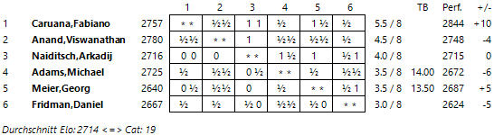 15.02.2013 - Zumindest hat Arkadij Naiditsch mal wieder nachgewiesen, dass man mit der Abtauschvariante im Spanier durchaus auf Gewinn spielen kann, doch das wird dem Deutschen im Moment kein Trost sein. Obwohl er mit gewohnt offenem Visier Fabiano Caruana mächtig unter Druck setzte, als es darauf ankam, fand Naiditsch nicht die besten Züge und stand zur ersten Zeitkontrolle gar auf Verlust. Wenig später folgte die unvermeidliche Aufgabe. Damit baut Caruana seine Führung mit einem bläulichen Auge auf einen ganzen Punkt aus, denn Viswanathan Anand teilte den Punkt mit Georg Meier. Zunächst hatte der Weltmeister das bessere Endspiel, doch im Gewinnstreben hätte er es sogar beinahe noch übertrieben. Zu einem weitaus leichteren Remis kam Geburtstagskind Daniel Fridman gegen Michael Adams. Der Brite gestattete einen leichten deutschen Vorteil, hielt den Laden aber dafür auch gekonnt zusammen. Caruana trifft in Runde 9 mit Weiß auf Adams, Anand hat Weiß gegen Fridman, und Meier wird mit Weiß versuchen, gegen Naiditsch die Niederlage aus der Hinrunde wett zu machen.