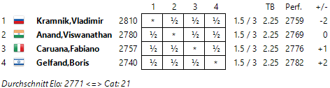 25.02.2013 - Unter den Augen von Gast-Kommentator Garry Kasparov kämpften in einem Najdorf-Sizilianer mit frühem 6.h3 und 7.g4 Viswanathan Anand und Boris Gelfand in der dritten Runde der Zürich Chess Challenge 2013 ein Duell mit offenen Visieren. Im Mittelspiel schien der Weltmeister Vorteil zu haben, und er gewann auch einen Bauern, doch Gelfand erreichte letztlich ein haltbares Turmendspiel. Hochklassig war auch die Partie zwischen Fabiano Caruana und Vladimir Kramnik. Die russische Nummer 2 der Welt versuchte sich seit langer Zeit mal wieder an Benoni und leitete so ein munteres Spielchen mit vielen taktischen Scharmützeln ein. Doch es half alles nichts, auch diese Partie endete friedlich. Somit liegt die Remisquote zur Halbzeit beim hundert Prozent. Davon können sich die Spieler am Dienstag erholen. Die Rückrunde beginnt am Mittwoch um 15 Uhr.