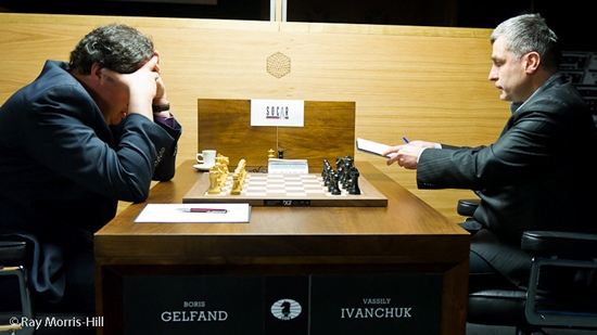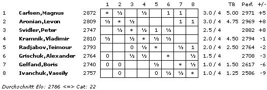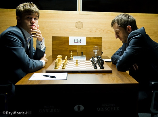 19.03.2013 - Aus der Eröffnung holte Magnus Carlsen gegen Alexander Grischuk in der vierten Runde des Kandidatenturniers 2013 mal wieder nicht viel heraus, aber es genügte, um den Gegner zum langen Grübeln zu verführen. Grischuk gab zu, dass er seine Stellung in der Folge überschätzte, deshalb in Nachteil geriet und dann verlor. Zuvor hatte Levon Aronian gegen Peter Svidler ein recht zügiges Remis produziert und musste zuschauen, wie die Nummer 1 der Weltrangliste mit ihm gleichzog. Im Duell der Oldies zwischen Boris Gelfand und Vassily Ivanchuk ging es hoch her, und lange waren alle drei Ergebnisse möglich, aber schlussendlich verhinderte der Ukrainer seine dritte Zeitüberschreitung mit einer dreimaligen Stellungswiederholung. Die längste Partie spielten Teimour Radjabov und Vladimir Kramnik. Ernsthaft gestört wurde das Gleichgewicht zwar nie, aber spannend war auch dieses Duell allemal. Allen Unkenrufen zum Trotz ist das Kandidatenturnier bisher sehr unterhaltsam, und so freuen wir uns schon jetzt auf die morgige fünfte Runde. Pünktlich um 15 Uhr geht es los.