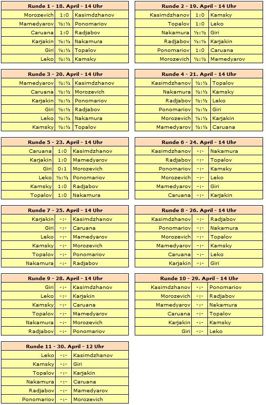 Gespielt wird ein elfrundiges Rundenturnier mit zwölf Spielern. Rundenstart ist täglich um 14:00 Uhr unserer Zeit, lediglich die letzte Runde beginnt bereits um 12:00 Uhr. Am 22. und 27. April wird jeweils ein Ruhetag eingelegt.