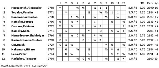23.04.2013 - Die fünfte Runde des FIDE Grand Prix in Zug erlebte eine Premiere im laufenden Wettbewerb: Schwarz gewann eine Partie. Alexander Morozevich brach den Fluch und schlug als Nachziehender Anish Giri. Damit steht es "nur" noch 9:1 für Weiß. Zuvor hatte schon Sergey Karjakin mit leichter Hand die seit zwei Runden andauernde Remisflaute gegen Shakhriyar Mamedyarov beendet. Damit ist der Russe gut im Rennen, liegt aber hinter Moro und auch Topi zurück. Veselin Topalov besiegte nämlich Hikaru Nakamura. Dafür hielt Gata Kamsky bei seinem Erfolg gegen Teimour Radjabov die Stars & Stripes hoch. Letztlich beendete Fabiano Caruana mit seinem Sieg gegen Rustam Kasimdzhanov die fünfte Runde. Nur Peter Leko und Ruslan Ponomariov trennten sich remis. Runde 6 beginnt am Mittwoch um 14 Uhr.