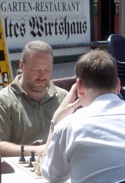 04.07.2005 - Am Anfang hatten sie alle gut lachen: Bürgermeister Altenkamp war gekommen, um zum Auftakt des 1. Bad Sodener Freiluft Chess960 Turnier den Teilnehmern "Glückauf" zu wünschen und die Eröffnungspartie gegen den Vorsitzenden des Schachclub Bad Soden Roland Bettenbühl zu spielen. Lefti Chatsiathanasiadis freute sich über die starke Teilnehmer-Resonanz und die zahlreichen Zuschauer, die das Geschehen vor seinem Restaurant "Altes Wirtshaus" am Adlerplatz in Bad Soden verfolgten. Organisator Hans-Walter Schmitt freute sich, weil er sich gute Chancen auf einen Turniersieg ausrechnete, denn sein Angstgegner, FM Tilmann Vogler aus Mainz war nicht unter den Turnierteilnehmern. Und Turnierleiter Geir Smith-Meyer freute sich, mit seinem neuen Computer die Turnierergebnisse bequem und schnell auswerten zu können. Doch am Ende freute sich nur Einer: ihm war die Überraschung gelungen, er gab allen Turnierfavoriten das Nachsehen.