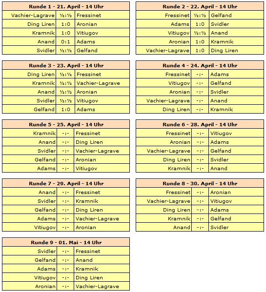 Gespielt wird ein neunrundiges Rundenturnier mit zehn Spielern. Rundenstart in Paris und St. Petersburg ist täglich um 14:00 Uhr unserer Zeit, was wohl auch für die letzte Runde gilt. Zwei Ruhetage werden eingelegt und zwar direkt hintereinander. Das heißt, am 26. und 27. April haben die Spieler genügend Zeit für die Reise von Frankreich nach Russland.