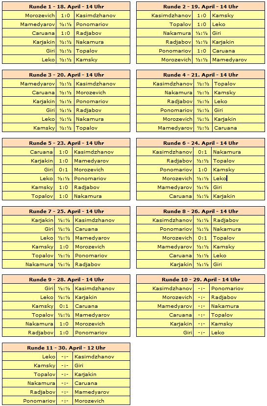 28.04.2013 - Mit einem Remis gegen Shakhriyar Mamedyarov hat Veselin Topalov in der neunten Runde seine alleinige Führung beim FIDE Grand Prix-Turnier in Zug erfolgreich verteidigt. Verfolger Ruslan Ponomariov leistete sich die erste Niederlage im laufenden Wettbewerb. Für seinen Gegner Teimour Radjabov war es im Gegenzug der erste Sieg. Zwei Runden vor dem Ende hat nun Fabiano Caruana die besten Chancen, Topalov noch abzufangen. Heute schlug der Italiener Gata Kamsky und morgen wird es zum Showdown gegen Topi kommen. Sollte einer gewinnen, kennen wir wahrscheinlich auch den Turniersieger. Nicht gänzlich ohne Chancen ist Hikaru Nakamura. Der Amerikaner schlug Alexander Morozevich, welcher damit zum dritten Mal in Serie verlor. Dabei hatte es so gut angefangen. Der Vollständigkeit halber: Die beiden noch unerwähnten Partien des heutigen Tages zwischen Anish Giri und Rustam Kasimdzhanov sowie Peter Leko und Sergey Karjakin endeten ohne Sieger, wobei besonders der Youngster aus den Niederlagen gehörig Glück hatte. Die zehnte Runde beginnt am Montag zur gewohnten Zeit um 14 Uhr.