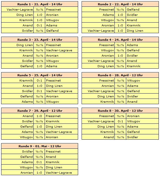 Der Modus lautete: 100 Minuten für 40 Züge, 50 Minuten für 20 Züge und 15 Minuten für den Rest der Partie. Zusätzlich gab es ab dem 1. Zug 30 Sekunden Bonus pro Zug.