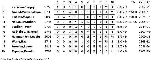 Mit einem ELO-Schnitt von 2766 wird die Turnierkategorie 21 erreicht.