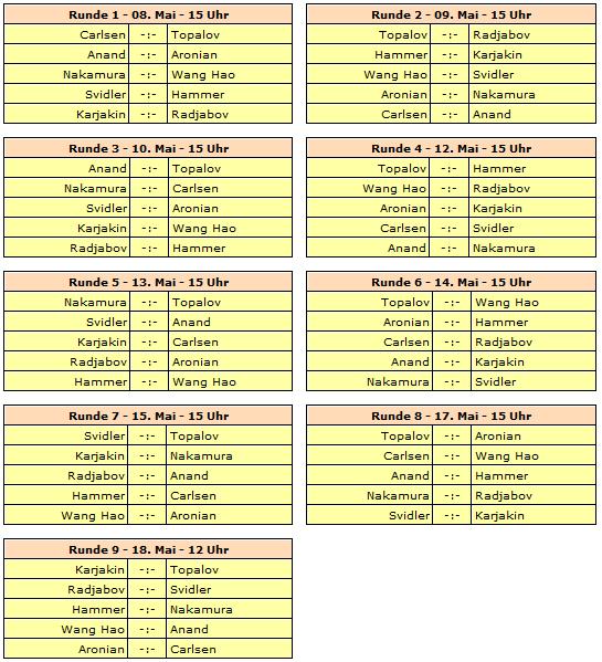 Gespielt wird ein neunrundiges Rundenturnier mit zehn Spielern. Rundenstart ist täglich um 15:00 Uhr unserer Zeit - lediglich die letzte Runde startet bereits um 12 Uhr. Ruhetage werden am 11. und 16. Mai eingelegt.