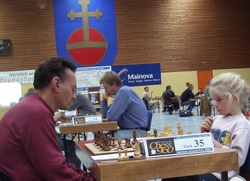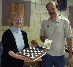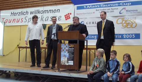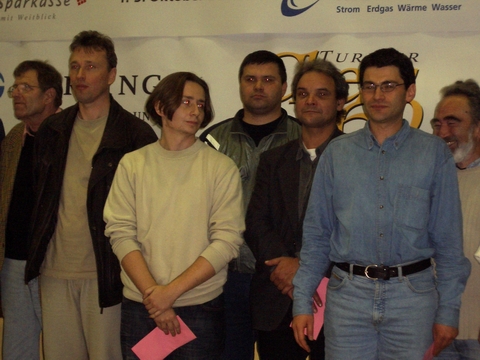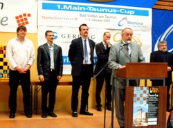 03.10.2005 - Am Ende kam es so wie es sich schon in den Spielrunden zuvor angedeutet hatte: Kein Spieler konnte sich entscheidend von den Mit-Konkurrenten absetzen, das Spitzen-Rudel war immer ganz eng zusammen. Und so musste am Ende der siebten und letzten Runde beim innovativen Chess960 Turnier in Bad Soden die Chip-Rechen-Technologie entscheiden: Mit etwas Glück bei der Auslosung, aber auch einer gehörigen Portion Können hatte am Ende GM Leonid Milov die Nase dank besserer Feinwertung vorne, punktgleich vor IM Yuri Boidman vom SC 1850 Remagen und GM Viesturs Meijers vom ESV Nickelhütte Aue, alle mit 6 Punkten aus 7 Partien.