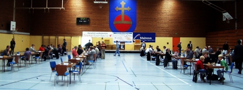 Turniersaal, Turnierleiter-Büro und Pressevertretern hin und her