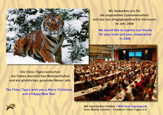 22.12.2006 - Ob für den Anfänger oder den Profi, für Schachspieler sind die schönsten Gaben unter dem Weihnachtsbaum noch immer die, die auch etwas mit dem königlichen Spiel gemein haben. Wenn Sie jedoch einem Lernenden das schenken möchten, was er wirklich braucht, um sich in allen Bereichen des Spiels zu verbessern, können Sie entweder aus einer schier unüberschaubaren Palette an CDs, DVDs und Büchern auswählen und dafür Unsummen auf den Tisch legen, oder Sie verschenken einfach eine Mitgliedschaft bei der Chess Tigers Universität.