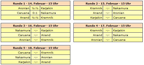 14.02.2015 - Unbedingter Siegeswille ist auch beim Schach fein, aber ab und zu übertreibt man es und fängt sich eine herbe Niederlage. So erging es heute Fabiano Caruana als Weißer gegen Hikaru Nakamura zum Auftakt der 4. Zürich Chess Challenge. Der Italiener erspielte sich eine bessere Stellung und wollte kurz vor der ersten Zeitkontrolle unbedingt etwas Zählbares erzwingen, aber dabei wurde er von seinem amerikanischen Gegenüber trocken ausgekontert. Spannend verliefen auch die beiden anderen Duelle. Levon Aronian griff Sergey Karjakins König an, doch dann sah der Armenier nicht mehr als Dauerschach. Dabei hätte es eine aussichtsreiche Möglichkeit gegeben. Viswanathan Anand und Vladimir Kramnik waren sich im Duell der Weltmeister ziemlich ebenbürtig. Der Inder stand zwar minimal besser, aber das reicht gegen Spieler wie Kramnik nur selten zu mehr als einem Remis - so auch heute nicht. Der Russe hat morgen Weiß gegen Nakamura, wie auch Anand gegen Aronian und Karjakin gegen Caruana. Wundern Sie sich in der Folge nicht über die beiden Tabellen, denn in Zürich gibt es für einen Sieg im Hauptturnier zwei Punkte und für ein Remis einen Punkt!