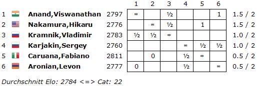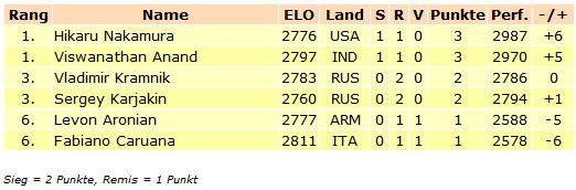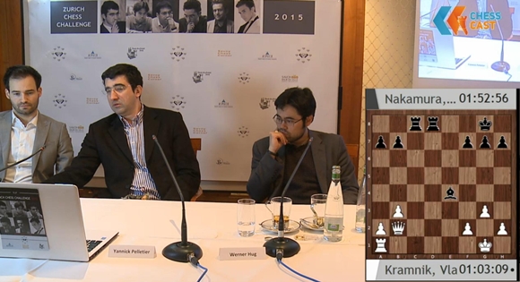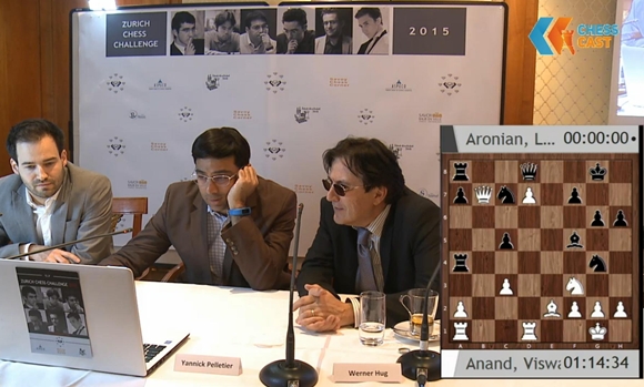15.02.2015 - Auch in der zweiten Runde der 4. Zürich Chess Challenge gab es nur eine entschiedene Partie. Viswanathan Anand spielte gegen Levon Aronian eine scharfe Variante im Grünfeldinder, die sein Gegner ebenfalls zu kennen glaubte. Aber an der entscheidenden Stelle stellte der Armenier entsetzt fest, dass nur sein Gegner wusste, wie die Stellung zu spielen war. Obwohl Aronian eine Mehrfigur hatte, fiel die schwarze Verteidigung zusammen wie ein Kartenhaus. Auch die beiden Remispartien zwischen Vladimir Kramnik und Hikaru Nakamura beziehungsweise Sergey Karjakin und Fabiano Caruana waren sehr gehaltvoll und endeten mit einem gerechten Ergebnis. Damit hat Anand nach Punkten mit Nakamura gleichgezogen und ziert mit dem Amerikaner die Spitze der Tabelle. In Runde 3 hat Vishy Schwarz gegen Caruana, Nakamura Weiß gegen Karjakin wie auch Aronian gegen Kramnik. Anpfiff ist wie zuvor um 15 Uhr.