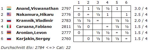 Der Turnierschnitt beträgt 2784, was der Turnierkategorie 22 entspricht.