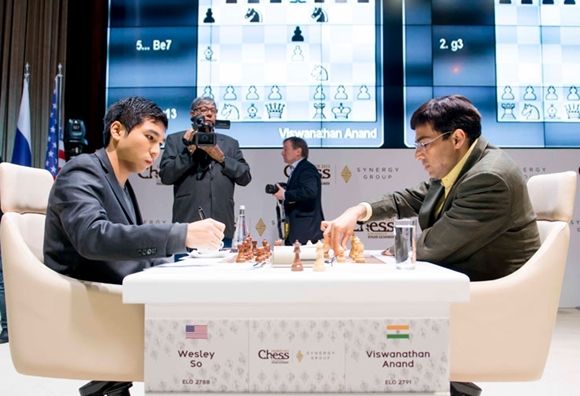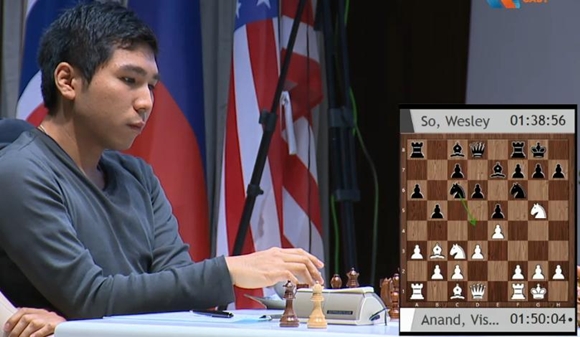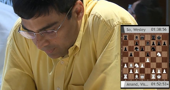 Im Fokus von Vijay Kumars Kamera (Video folgt weiter unten!) besiegte Viswanathan Anand in ihrer allerersten Turnierpartie den bisherigen Tabellenführer Wesley So
