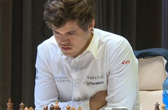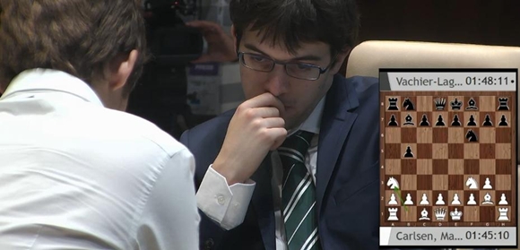 Hier wirkte Maxime Vachier-Lagrave gegen Magnus Carlsen noch recht optimistisch, hatte er doch 2...b5!? als Überraschung im Vorbereitungsköfferchen...