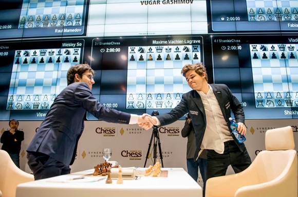 21.04.2015 - Es war das erste Mal, dass Viswanathan Anand und Wesley So in ihrer Karriere die Klingen kreuzten, und die 5. Runde des Gashimov Memorials wird der junge Wahl-Ami bestimmt nicht vergessen. Der indische Superstar bot seinem Gegner überraschend einen Springer zum Fraß an, den dieser schließlich auch nahm. Dies war bestimmt nicht der Grund der Niederlage, denn So erreichte immerhin ein Damenendspiel, welches zunächst haltbar schien. Doch Vishy, dem man jüngst seitens einiger "Experten" Schwächen im Endspiel attestiert hatte, zeigte, wie man ein Damenendspiel mit gleicher Bauernzahl dennoch gewinnen kann. Parallel ereignete sich zwischen Magnus Carlsen und Maxime Vachier-Lagrave auch Historisches. Unglaublich, aber wahr, der Norweger hatte zuletzt vor zehn(!) Jahren gegen den Franzosen eine klassische Partie gewonnen, heute jedoch ließ er diesem nach kuriosem Eröffnungsverlauf keine Chance. Den dritten Sieg des Tages errang Shakhriyar Mamedyarov gegen Vladimir Kramnik. Er zwang den Russen in ein schlechtes Endspiel, und nach mehrmaligem Nachfassen erzielte der Aserbaidschaner den ersten, erlösenden Heimsieg. Eine wundersame Rettung erfuhr Anish Giri, der gegen Fabiano Caruana eigentlich schon in der Eröffnung überspielt wurde, doch dieses Mal schaffte der Niederländer das Remis. Die geringste Aufregung kam zwischen Rauf Mamedov und Michael Adams auf. Das Gleichgewicht wurde nicht wesentlich gestört und der Punkt folgerichtig geteilt. Damit führt nun Magnus Carlsen, der mit Wesley So an der Spitze rochierte. Mit +1 folgt Vishy auf Rang 3 vor Kramnik und Mamedyarov mit jeweils 50 Prozent. O-Töne zur 5. Runde liefert das aktuelle Video von Vijay Kumar am Ende des Berichts. Morgen dürfen sich alle Spieler von den bisherigen Strapazen erholen, bevor am Donnerstag ab 12 Uhr Runde 6 ansteht.