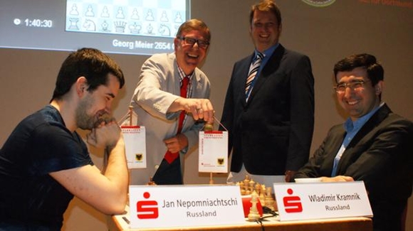 Gute Laune bei Organisator Gerd Kolbe, Turnierdirektor Michael Meinders und den Hauptakteuren Ian Nepomniachtchi und Vladimir Kramnik. Der 14. Weltmeister gewann einen Bauern und später mit etwas Dusel auch die Partie.
