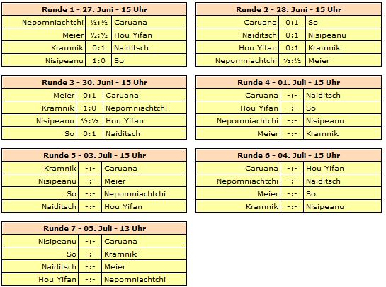 Gespielt wird ein siebenrundiges Rundenturnier mit acht Spielern. Rundenstart ist täglich um 15 Uhr unserer Zeit - lediglich die letzte Runde startet bereits um 13:00 Uhr. Ruhetage werden am 29. Juni und 02. Juli eingelegt.