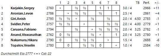Mit einem ELO-Schnitt von 2778 wird die Turnierkategorie 22 erreicht.