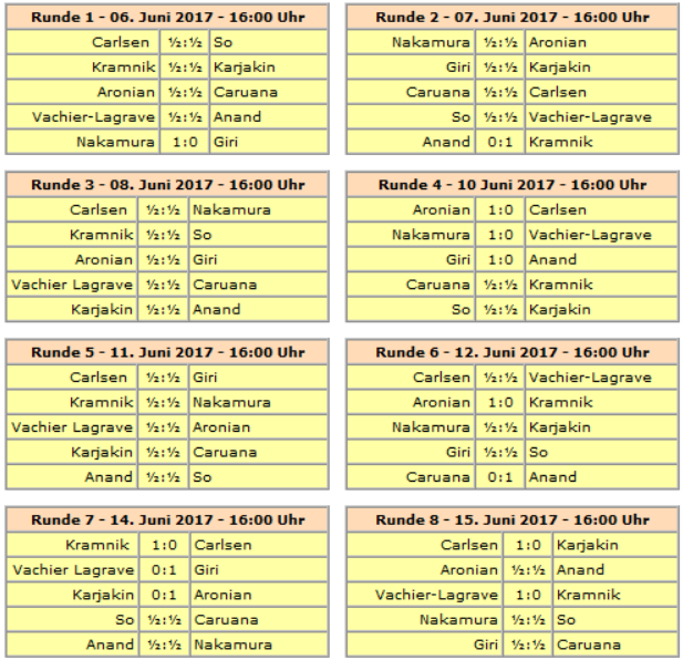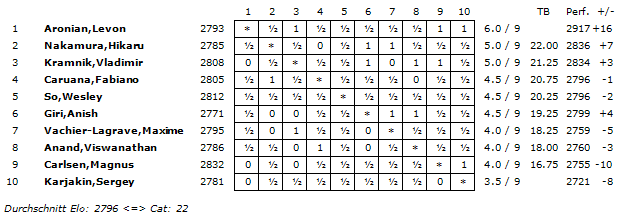 Mit einem ELO-Schnitt von 2796 wurde die Turnierkategorie 22 erreicht.