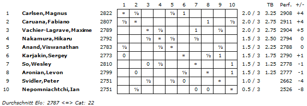 Mit einem ELO-Schnitt von 2787 wird die Turnierkategorie 22 erreicht.