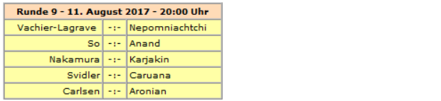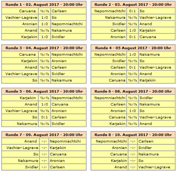 Sollte es am Ende zu einem Gleichstand um Platz 1 kommen, wird am 12. August ein Schnellschach- und ggf. Blitz-Tiebreak gespielt.