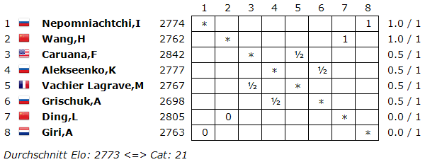 17.03.2020 - Schritt für Schritt wird in diesen Tagen weltweit das öffentliche Leben und damit auch die Sportwelt lahmgelegt, doch im russischen Jekaterinburg stemmen sich acht tapfere Schachspieler gegen das berüchtigte Corona-Virus. Vize-Weltmeister Fabiano Caruana, Ding Liren, Alexander Grischuk, Ian Nepomniachtchi, Maxime Vachier-Lagrave, Wang Hao, Anish Giri und Kirill Alekseenko spielen ab heute und bis zum 04. April völlig abgeschirmt von der bedrohlichen Außenwelt um das Recht, der nächste Herausforderer von Weltmeister Magnus Carlsen zu sein. "Nebenbei" hat das Turnier einen Rekord-Preisfonds von 500.000 Euro, was sicherlich allein schon Motivation genug sein dürfte. Eigentlich hätte auch Teimour Radjabov statt MVL antreten sollten, doch der Aseri traute dem Braten nicht und hätte lieber gesehen, dass das Kandidatenturnier verschoben wird. Die FIDE lehnte ab und nominierte die französische Nummer 1 nach. Den ersten Tag bestimmten jedoch Andere. Gleich zum Auftakt kam es zum China-Duell zwischen Ding Liren und Wang Hao, was Letzterer für sich entschied. Doch Wang darf sich nicht alleine an der Spitze sonnen, denn Nepomniachtchi legte gegen Giri nach und siegte ebenfalls. Derweil trennten sich MVL und Caruana sowie Grischuk und Alekseenko friedlich. Die zweite Runde beginnt am Mittwoch um 12 Uhr.