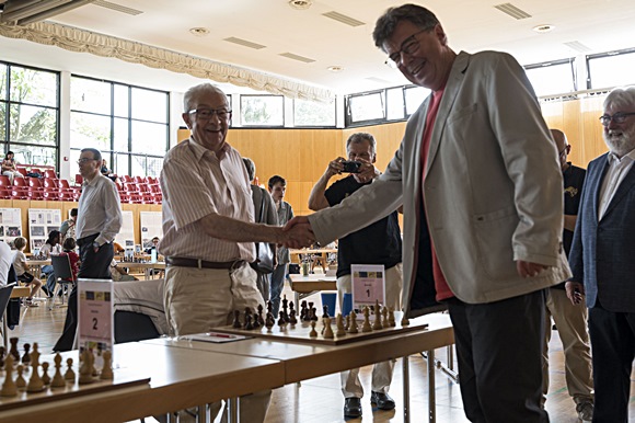 ... ja, ja, Bericht vom Simultan mit vier großen Meistern gegen 100 kleine Meister - nicht vergessen, aber der Füllfederhalter muss auch mal wieder ein bisschen abkühlen. Hier der Beweis: Remiskünstler Hans Mokry (SC Frankfurt-West 89 Jahre alt) gegen Blitzschachkönig GM Klaus Bischoff. Heute, zuerst einmal Spanien gegen Deutschland erleben (erledigen), danach am Samstag und Sonntag Seminar mit GM Michael Prusikin sich reinziehen "Thema 1.e4 gegen alles und jeden" und dann gehts weiter mit den Berichten und Analysen.