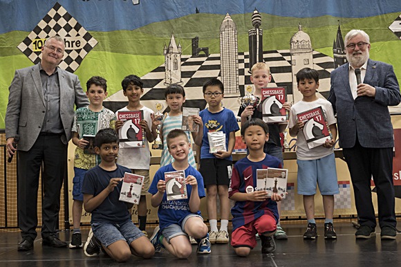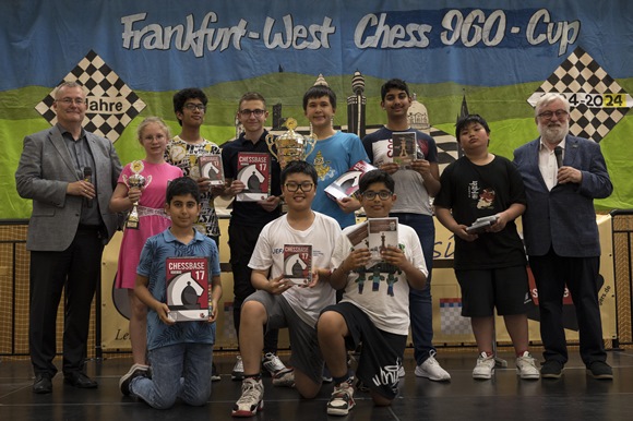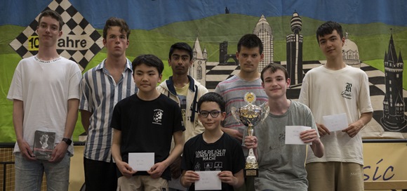Stehend v.l.n.r: Rainer Woisin (Geschäftsführer ChessBase GmbH, Sponsor aller Preise), 6.Sunwoo Kim (International School Frankfurt 5,5/27,0), 4.Harshil Praddep (vereinslos 6,0/33,5), Bestes Mädchen mit Pokal: 11.Theodora Siyuan Lao (SK Bad Homburg (5,0/30,5), 3.Yunqi Li (SV 59 Kornwestheim 6,0/34,0), Sieger Peter Steinbrenner mit Pokal (SK Kaiserslautern 6,5/30,5), 2.Jonas Liu (SV Oberursel 6,0/35,0), Hans-Walter Schmitt (Projektleiter & Ehrenpräsident SC Frankfurt-West), kniend v.l.n.r.: 7. Narsinhbhan Bhosale (SC Bad Soden 5,0/33,0), 5. Mikhail Grigorian (SAbt TuS Makkabi Frankfurt) 6,0/27,5) 7. Liam Schröder (SC Rochade Saarluis 5,0/33,0),