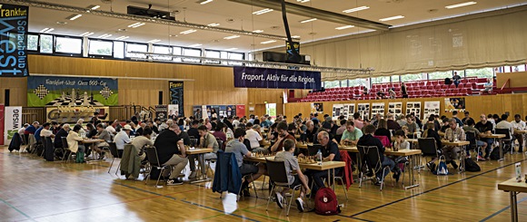 Blick vom großen Chess Tigers Stand in den geräumigen Turniersaal in dem Saalbau Frankfurt-Zeilsheim ...