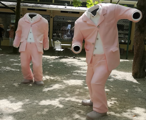 Kleine Kunstfiguren - kopflose rosa Anzüge mit schwarzen "Löchern"